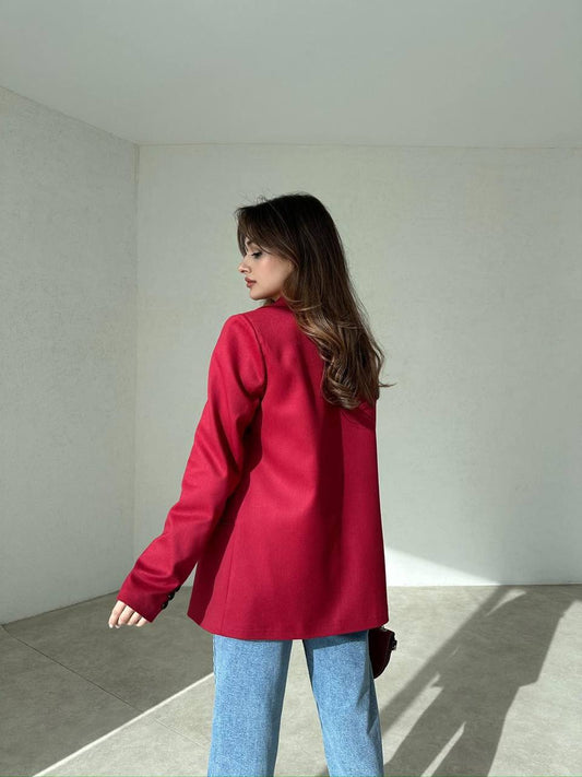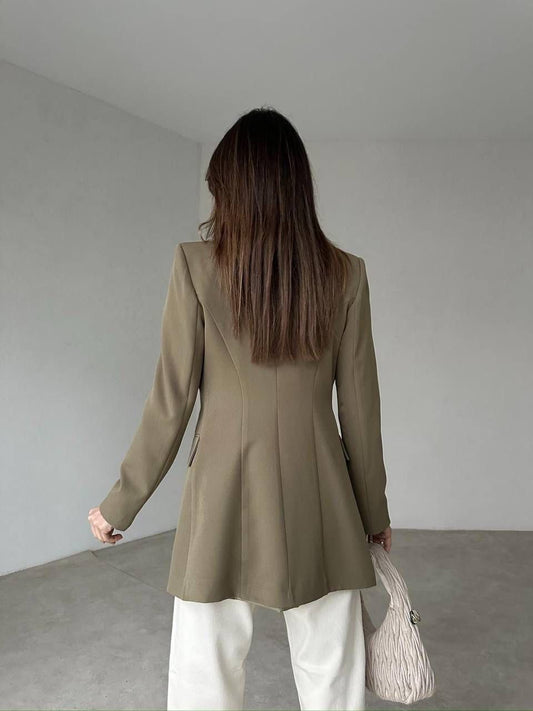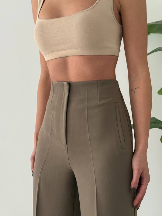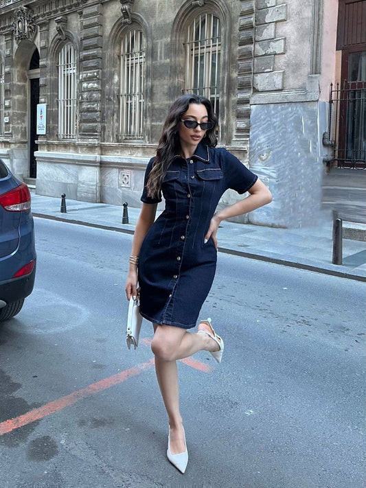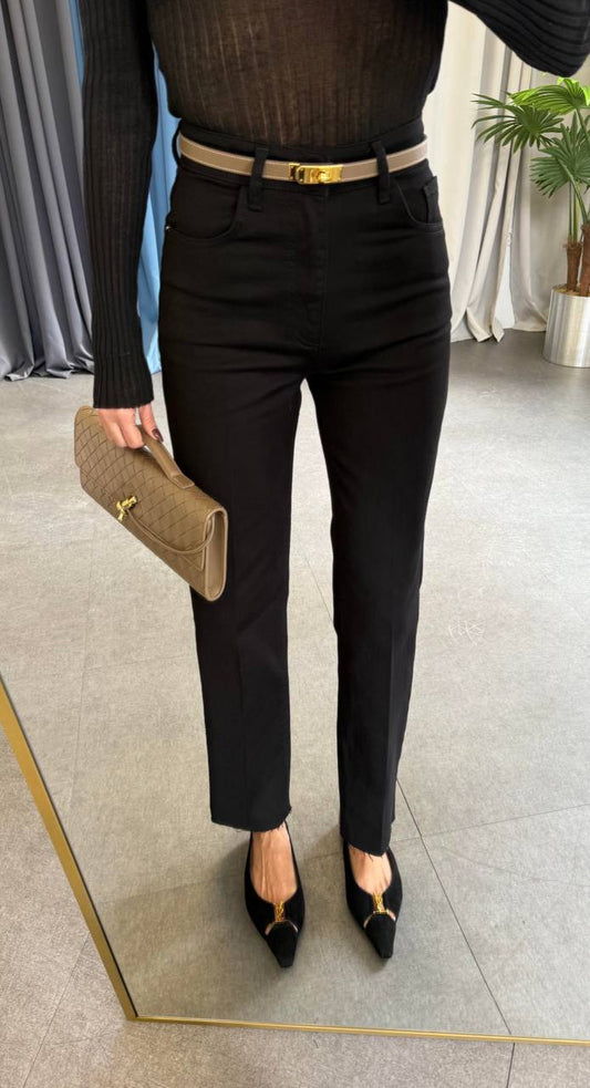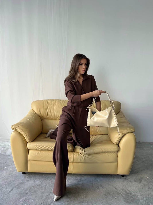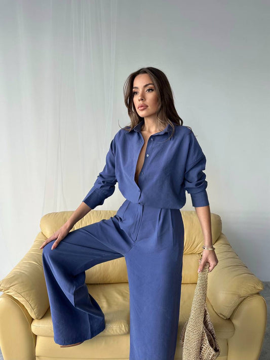 طقم بلون أزرق كحلي ناعم مكوّن من قميص بأزرار وبنطلون واسع بستايل كلاسيكي مع لمسة مودرن